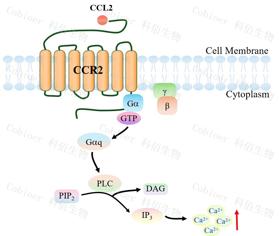 CCR2 與配體結(jié)合,導(dǎo)致 Gαq 亞基的激活,觸發(fā) PLC-γ,從而產(chǎn)生兩個第二信使:IP3 和 DAG,它們參與細(xì)胞內(nèi)鈣動員。