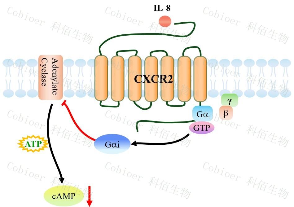 cAMP 在 G 蛋白偶聯(lián)受體(GPCR)信號(hào)轉(zhuǎn)導(dǎo)中是一種關(guān)鍵的第二信使。當(dāng)配體結(jié)合 到 GPCR,構(gòu)象發(fā)生變化,激活受體接著激活 G 蛋白,Gi 的激活導(dǎo)致腺苷酸環(huán)化酶調(diào)控 cAMP 的下調(diào)。CXCR2 CHO 藥靶模型很好的模擬了體內(nèi) CXCR2 的信號(hào)轉(zhuǎn)導(dǎo)過(guò)程,原理見(jiàn) 下圖所示。