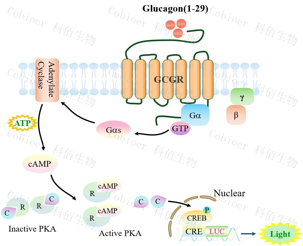 GCGR CRE-Luc HEK293 報告基因藥靶模型很好的模擬了體內(nèi) GCGR 的信號轉(zhuǎn)導(dǎo)過程, 原理見下圖所示。