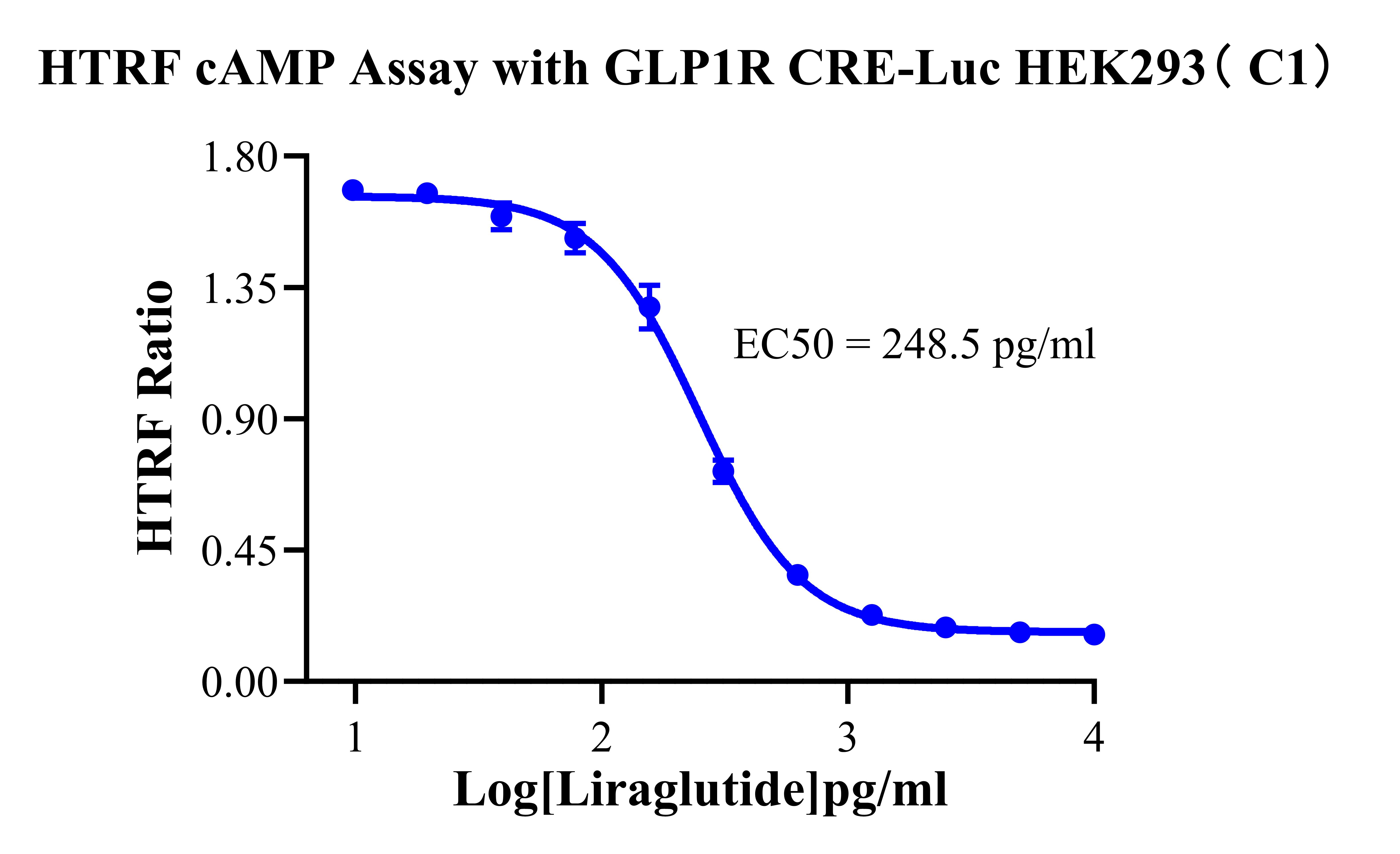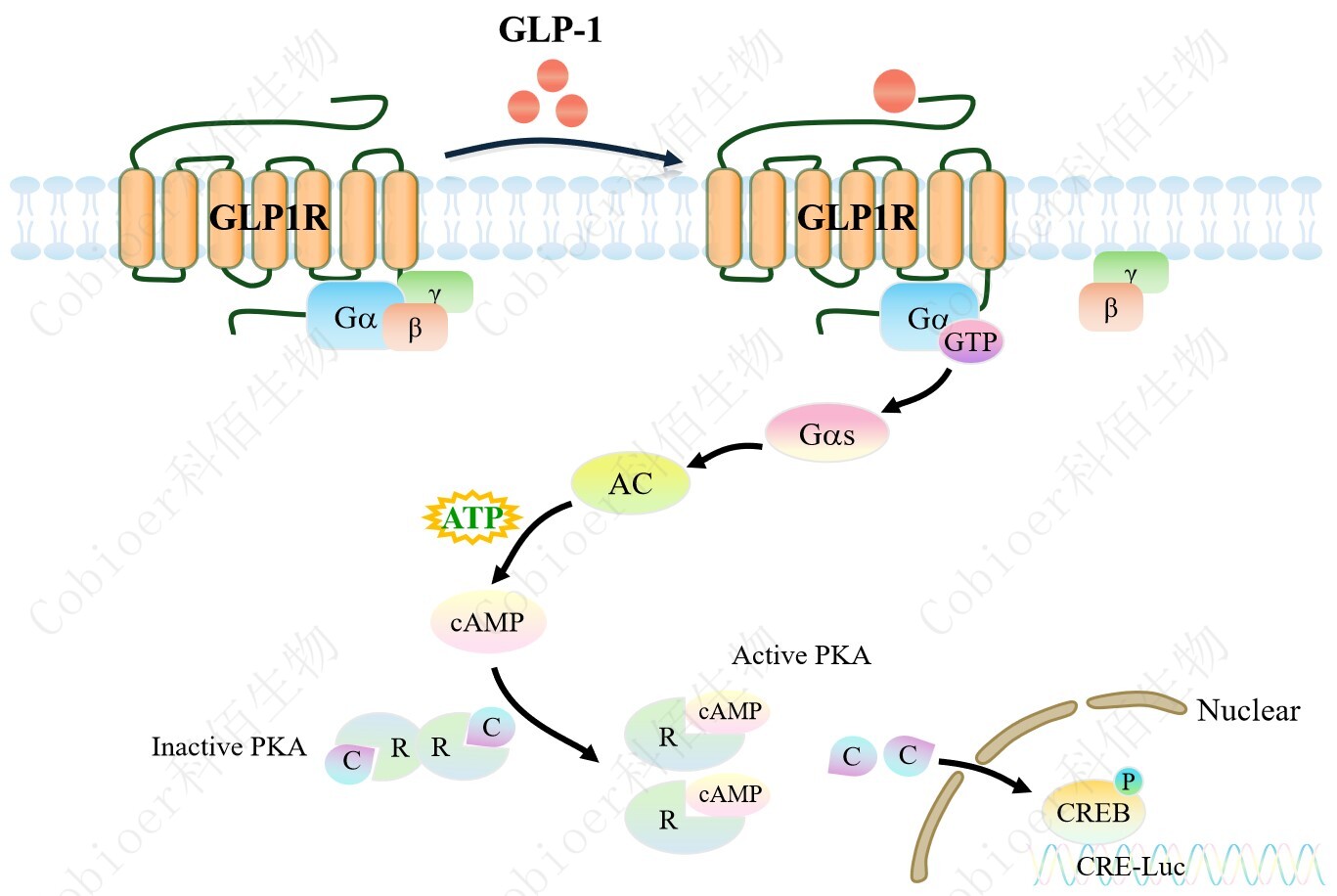 GLP1R CRE-Luc HEK293 報告基因藥靶模型很好的模擬了體內(nèi) GLP1R 的信號轉(zhuǎn)導(dǎo)過程,原理見下圖所示。 Figure 1. GLP1R CRE-Luc HEK293 細(xì)胞模型原理圖
