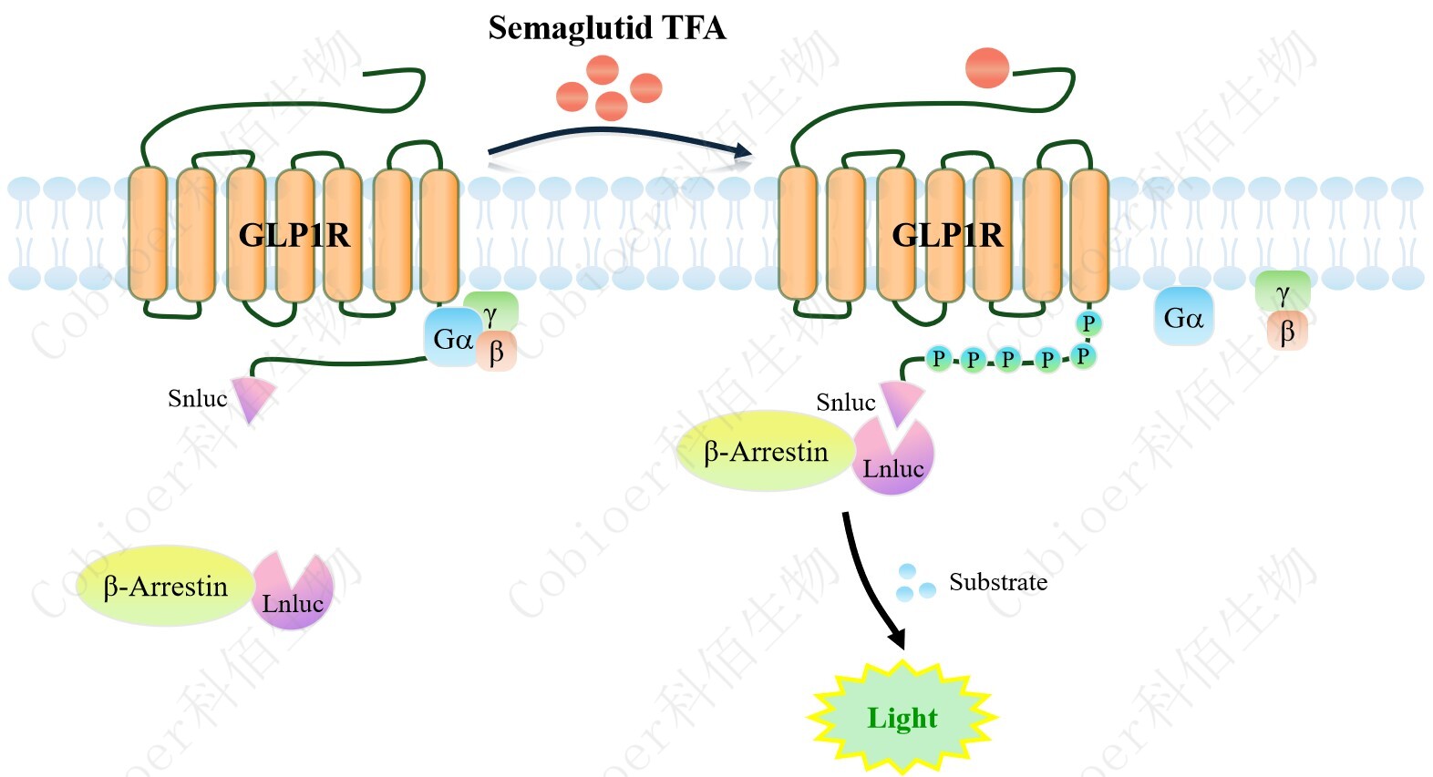 GLP1R β-Arrestin CHO 報(bào)告基因藥靶模型很好的模擬了體內(nèi) GLP1R/β-Arrestin 的信號(hào) 轉(zhuǎn)導(dǎo)過程,原理見圖 2 所示。當(dāng)缺乏配體刺激時(shí),β-Arrestin 不與 GLP1R 結(jié)合,融合β- Arrestin 的熒光素酶處于失活構(gòu)象,當(dāng) GLP1R 遭遇配體刺激時(shí),融合熒光素酶報(bào)告基因的 β-Arrestin 被招募,使熒光素酶報(bào)告基因處于激活狀態(tài),加入其底物后發(fā)光信號(hào)增強(qiáng)。 Figure 1. GLP1R β-Arrestin CHO 細(xì)胞模型原理圖