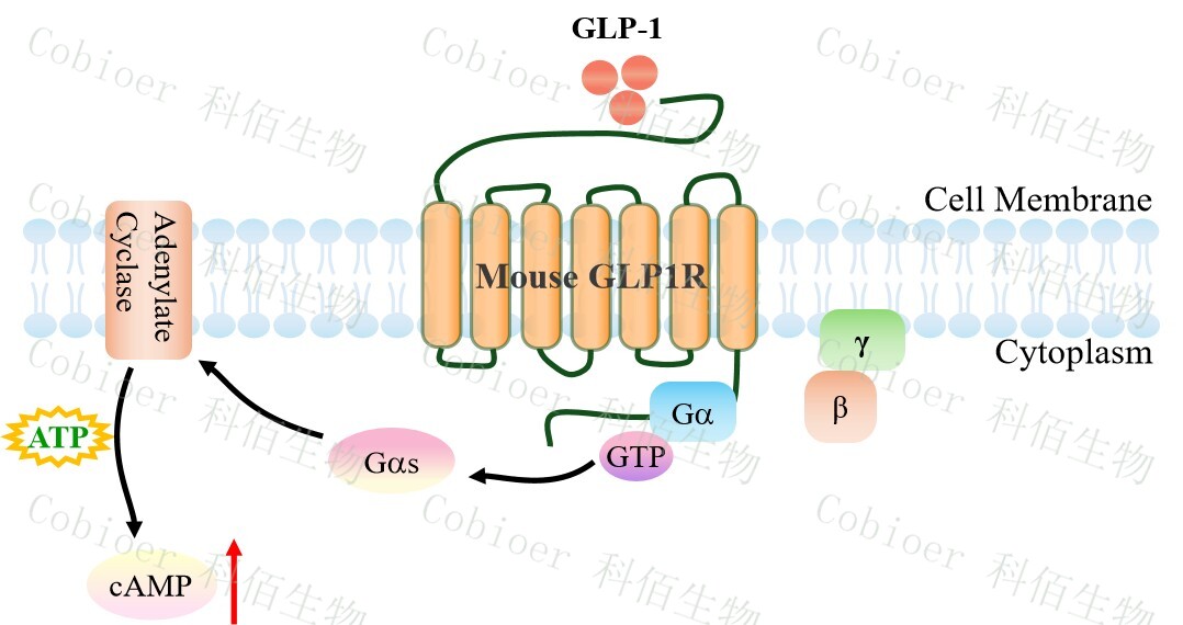 cAMP cAMP 在 G 蛋白偶聯(lián)受體(GPCR)信號轉(zhuǎn)導(dǎo)中是一種關(guān)鍵的第二信使。當(dāng)配體結(jié)合到 GPCR,構(gòu)象發(fā)生變化,激活受體接著激活 G 蛋白,Gs 的激活導(dǎo)致腺苷酸環(huán)化酶調(diào)控 cAMP 的升高。 GLP1R 藥靶模型很好的模擬了體內(nèi) GLP1R 的信號轉(zhuǎn)導(dǎo)過程,原理見下圖所示。 ![]() Figure 1. Mouse GLP1R CHO 細(xì)胞模型原理圖 |