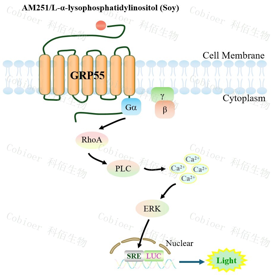 GPR55 Reporter Cell 藥靶模型很好的模擬了體內(nèi) GPR55 的信號(hào)轉(zhuǎn)導(dǎo)過(guò)程,原理見(jiàn)下圖所示。 ![]() Figure 1. GPR55 Reporter Cell 細(xì)胞模型原理圖 |