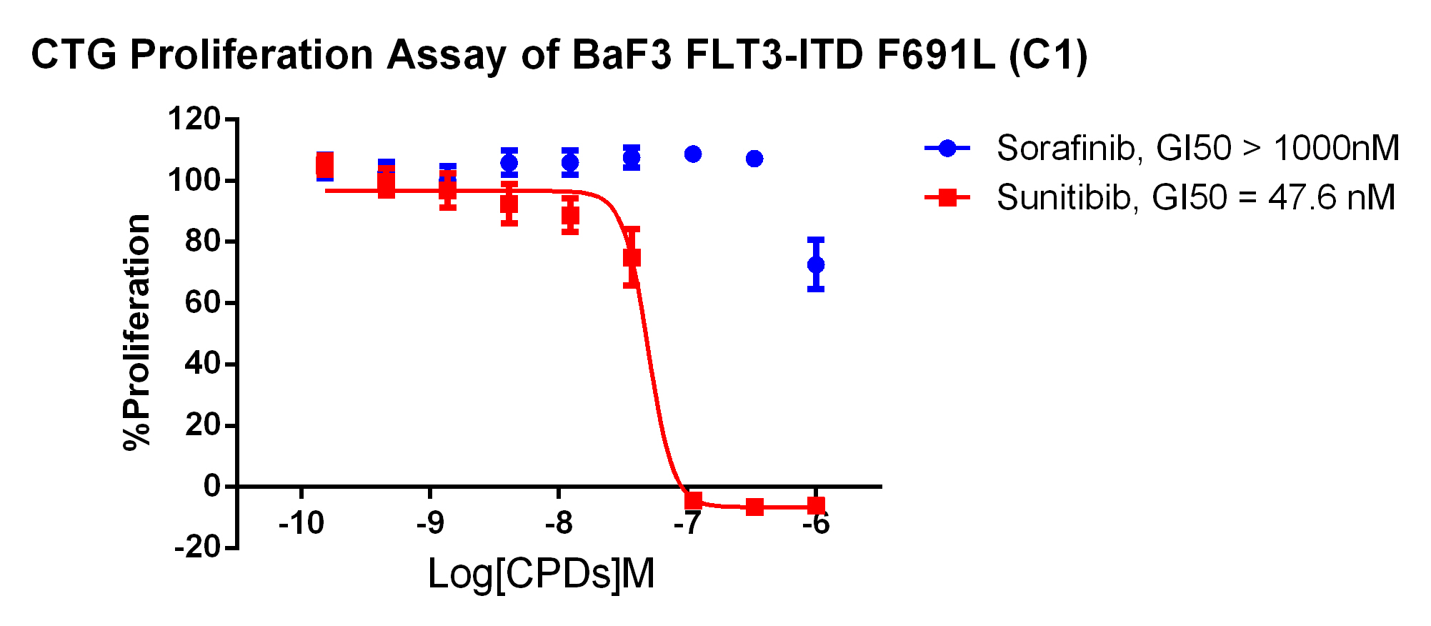 Figure 4. Anti-proliferation assay of two reference compounds on the FLT3-ITD [F691L]/BaF3 Stable Cell Line. |