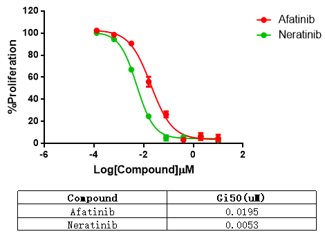 Figure 2. Anti-proliferation assay of two reference compounds on the Her2 A775_G776insYVMA/BaF3 Stable Cell Line