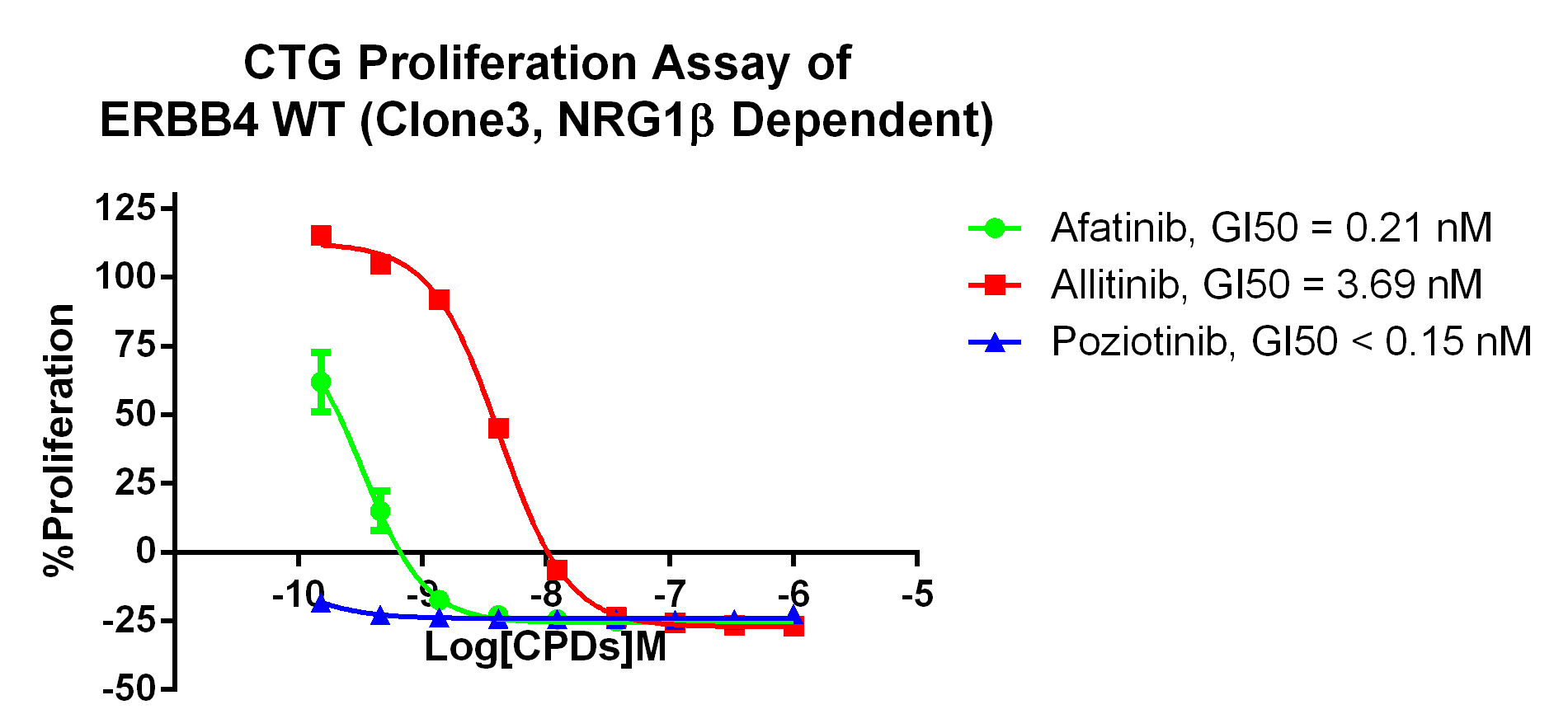 2. Anti-proliferation assay Figure 2. Anti-proliferation assay of three reference compounds on the ERBB4 WT(NRG1b Dependent)/BaF3 Stable Cell line. |