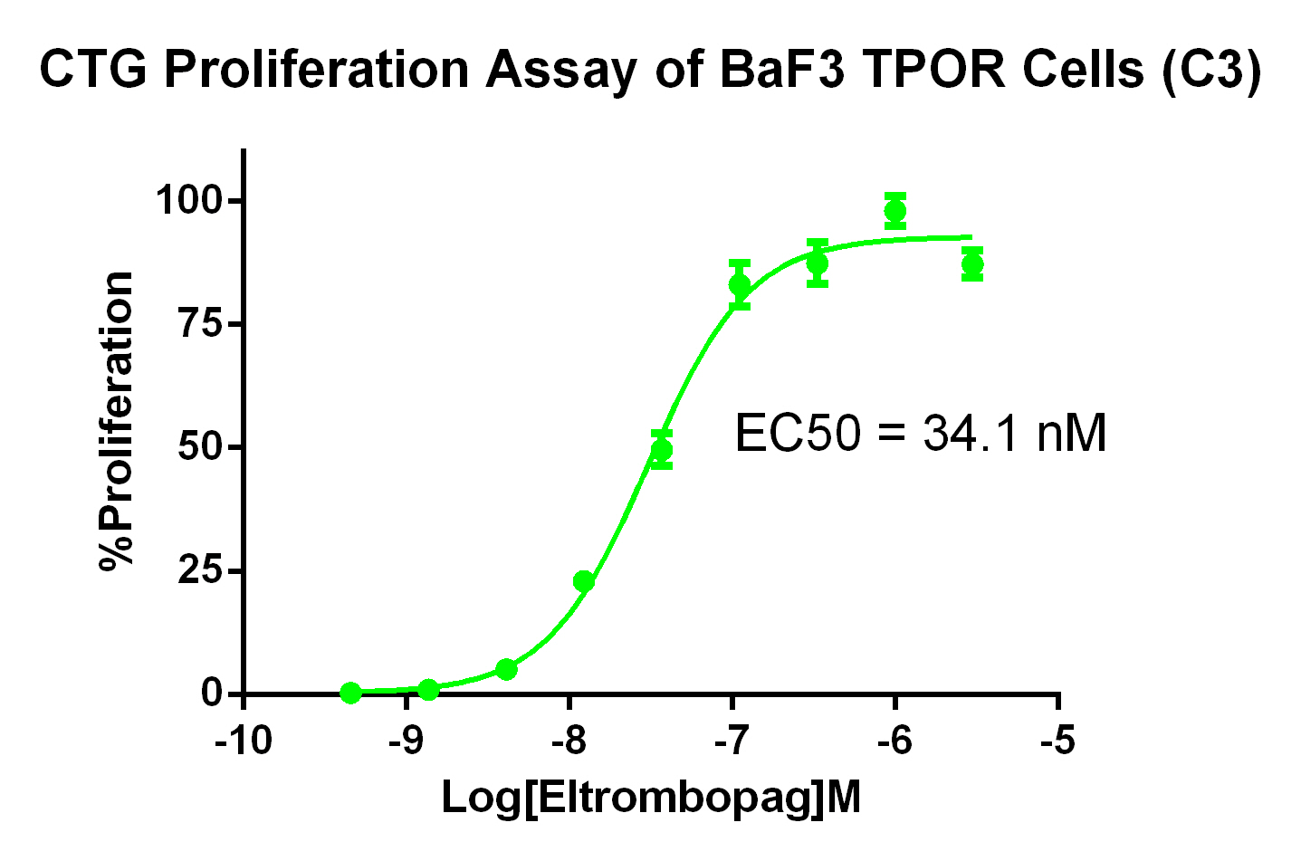 2.Anti-proliferation assay Figure 2. CTG Proliferation Assay of BaF3 TPOR Cells (C3), the EC50=34.1nM. |