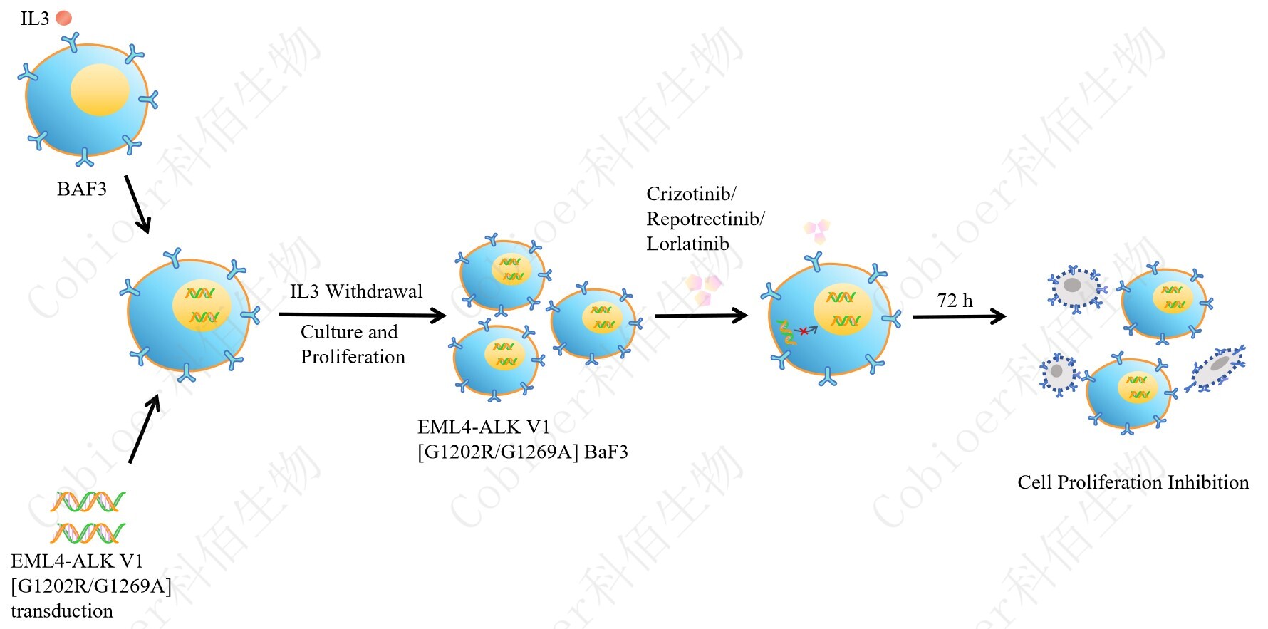 BaF3(小鼠原 B 細(xì)胞)的生長(zhǎng)和增殖需要 IL-3 的維持。通過(guò)引入各種表達(dá)激酶的基因, 能作為 BaF3 的驅(qū)動(dòng)基因,讓 BaF3 不再依賴 IL-3 而增殖,進(jìn)而激酶基因成為 BaF3 增殖依 賴的驅(qū)動(dòng)基因,用于評(píng)估小分子藥物對(duì)激酶的靶向抑制作用,原理及流程見(jiàn)下圖所示。