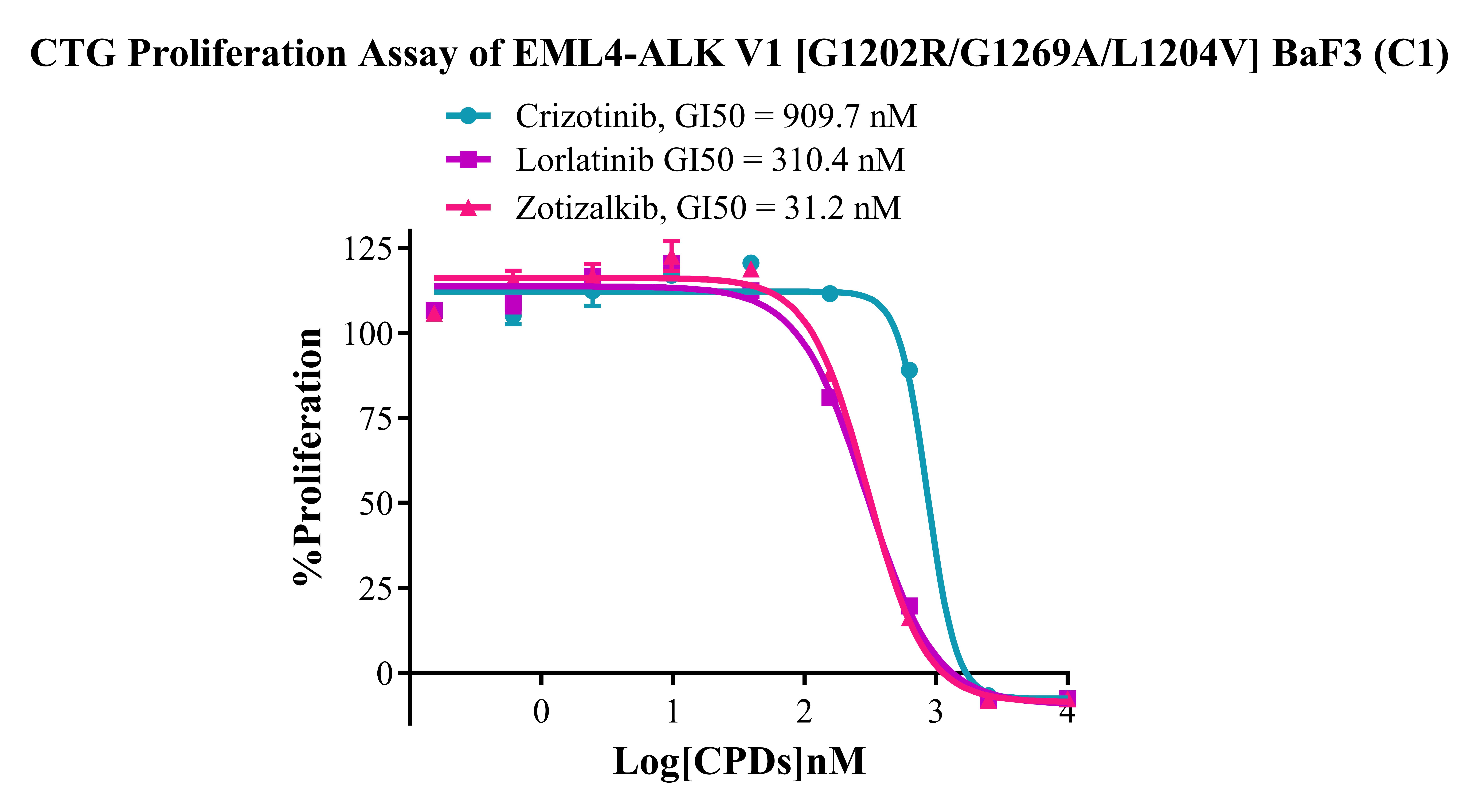 Figure 5. CTG Proliferation Assay of EML4-ALK V1 [G1202R/G1269A/L1204V] BaF3 (C1).