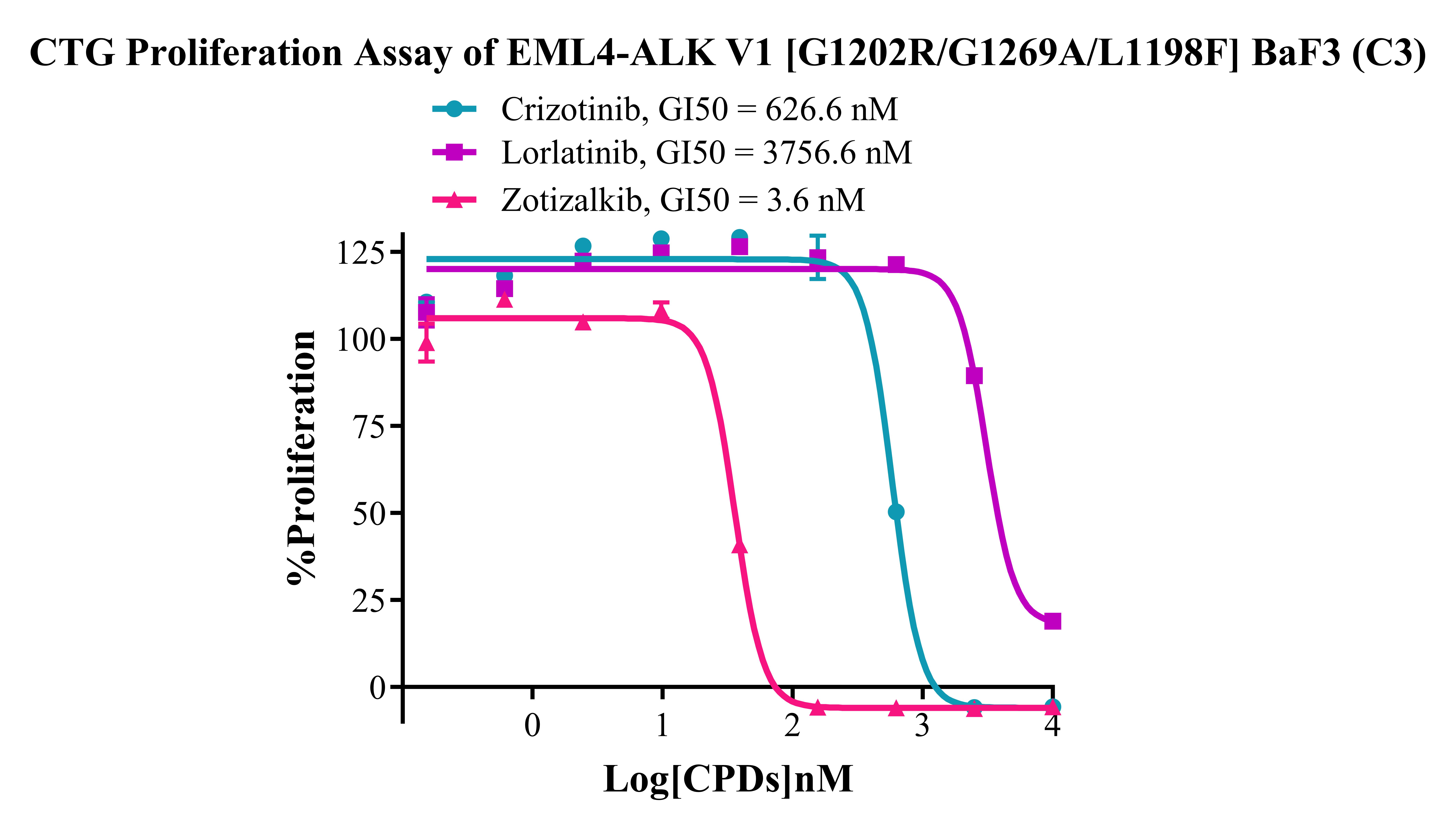 3. Anti-proliferation assay Figure 5. CTG Proliferation Assay of EML4-ALK V1 [G1202R/G1269A/L1198F] BaF3(C3). |