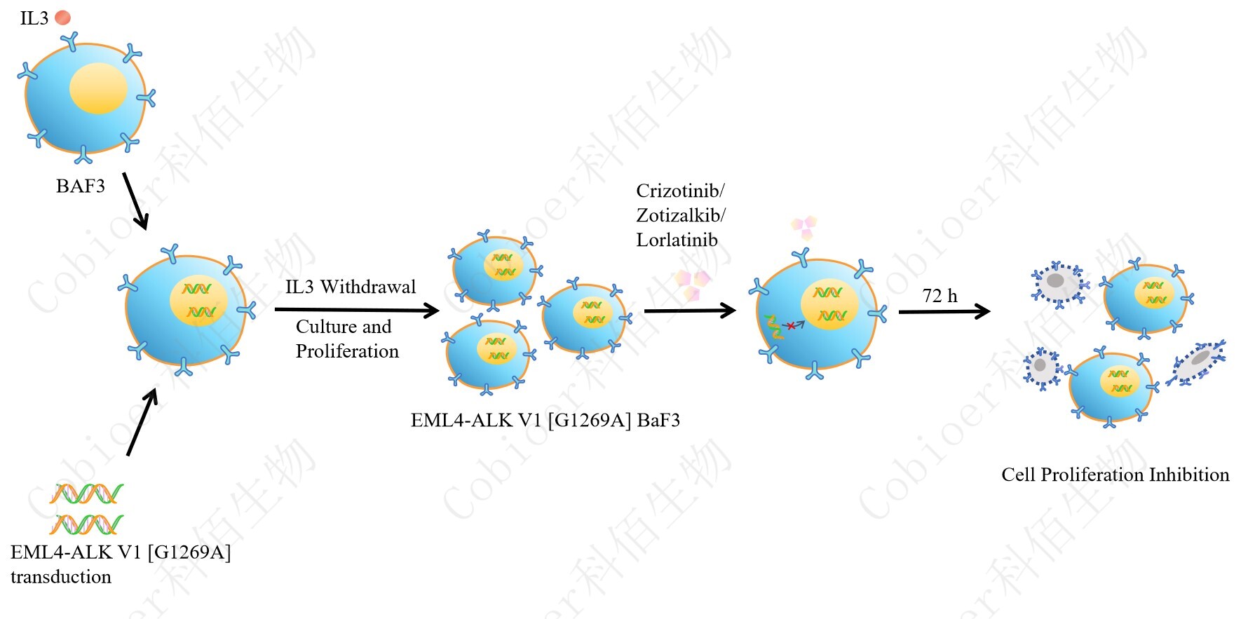 BaF3(小鼠原 B 細胞)的生長和增殖需要 IL-3 的維持。通過引入各種表達激酶的基因, 能作為 BaF3 的驅動基因,讓 BaF3 不再依賴 IL-3 而增殖,進而激酶基因成為 BaF3 增殖依 賴的驅動基因,用于評估小分子藥物對激酶的靶向抑制作用,原理及流程見下圖所示。