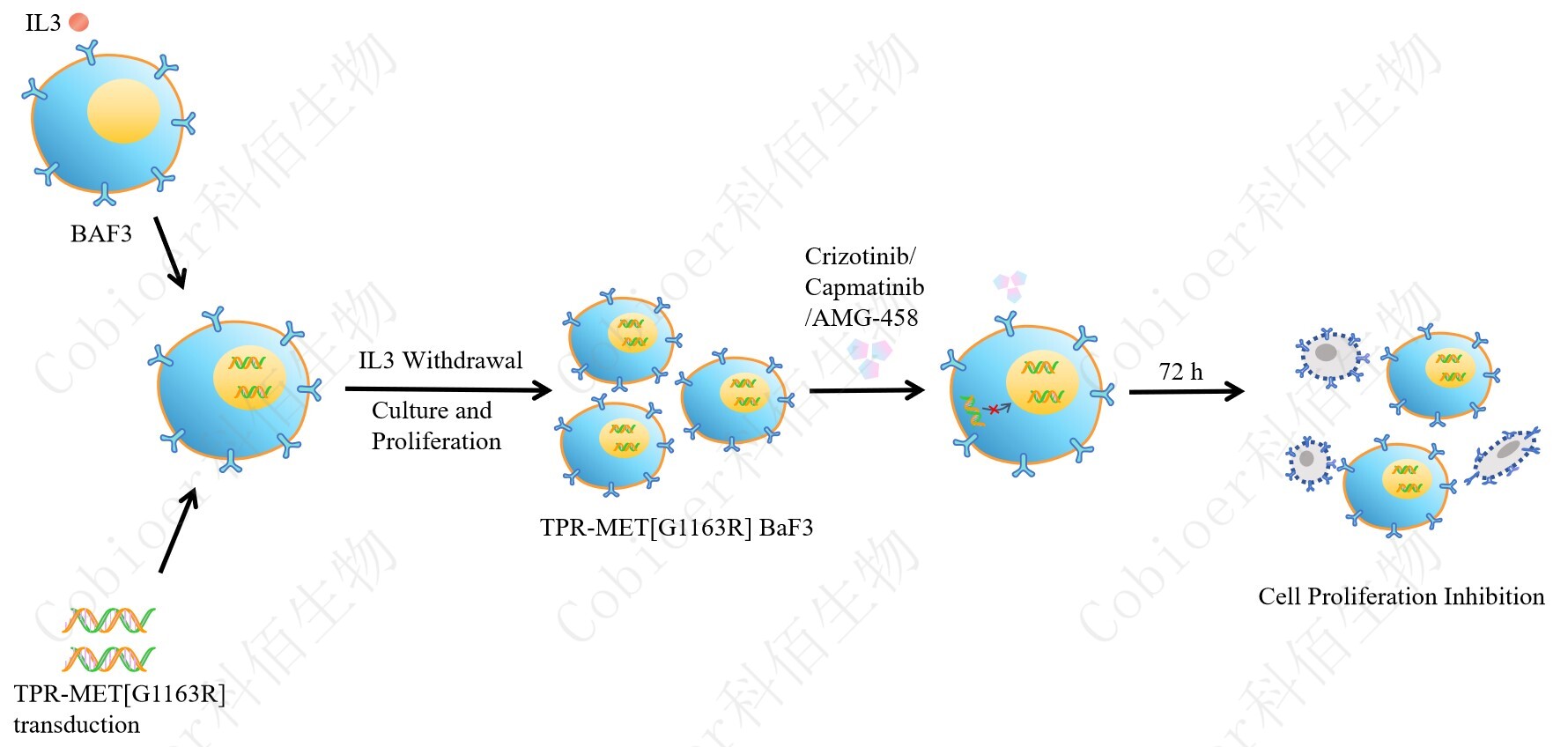 BaF3(小鼠原 B 細胞)的生長和增殖需要 IL-3 的維持。通過引入各種表達激酶的基因, 能作為 BaF3 的驅(qū)動基因,讓 BaF3 不再依賴 IL-3 而增殖,進而激酶基因成為 BaF3 增殖依 賴的驅(qū)動基因,用于評估小分子藥物對激酶的靶向抑制作用,原理及流程見下圖所示。![]() Figure 1. TPR-MET[G1163R] BaF3 細胞的構(gòu)建原理圖 |