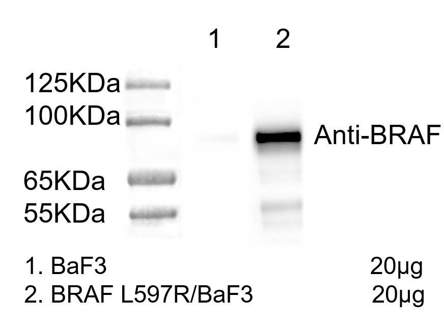 BRAF L597R lies within the protein kinase domain of the Braf protein (UniProt.org). L597R results in activation of Braf as indicated by increased phosphorylation of Mek and Erk in cell culture, is associated with Erk activation in a patient tumor sample, and in one of two cell lines, increased cell proliferation and cell viability compared to wild-type Braf. | |