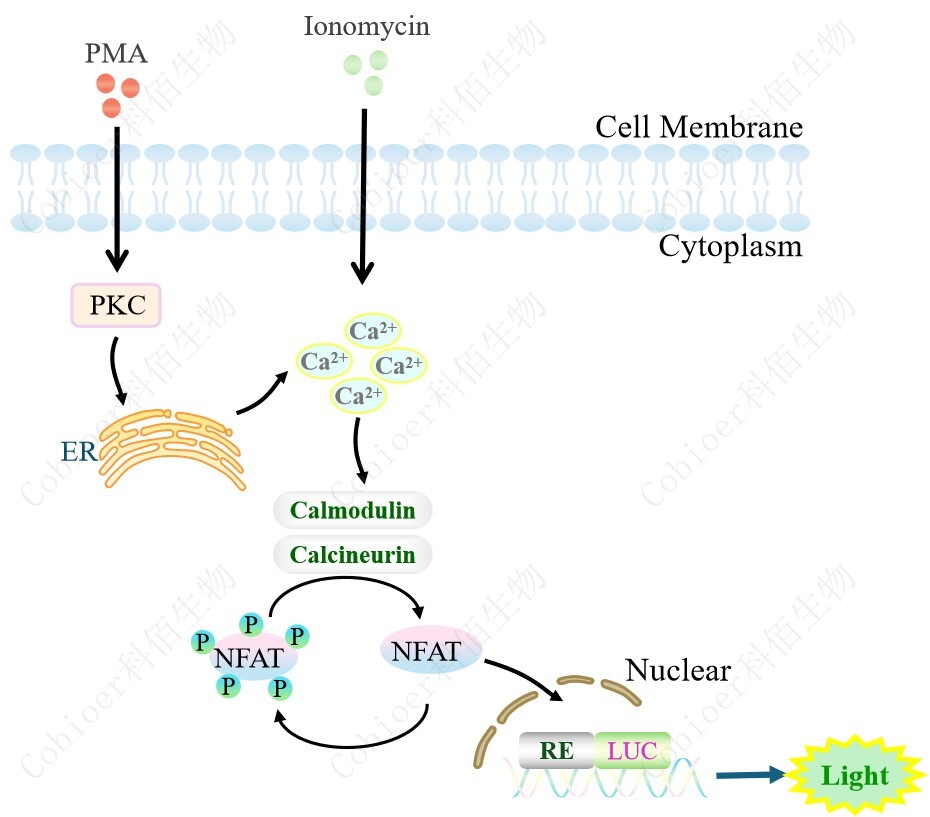 NFAT-Luc HEK293 報告基因藥靶模型很好的模擬了體內 NFAT 的信號轉導過程,原理見下圖所示。 ![]() Figure 1. NFAT-Luc HEK293 細胞模型原理圖 |