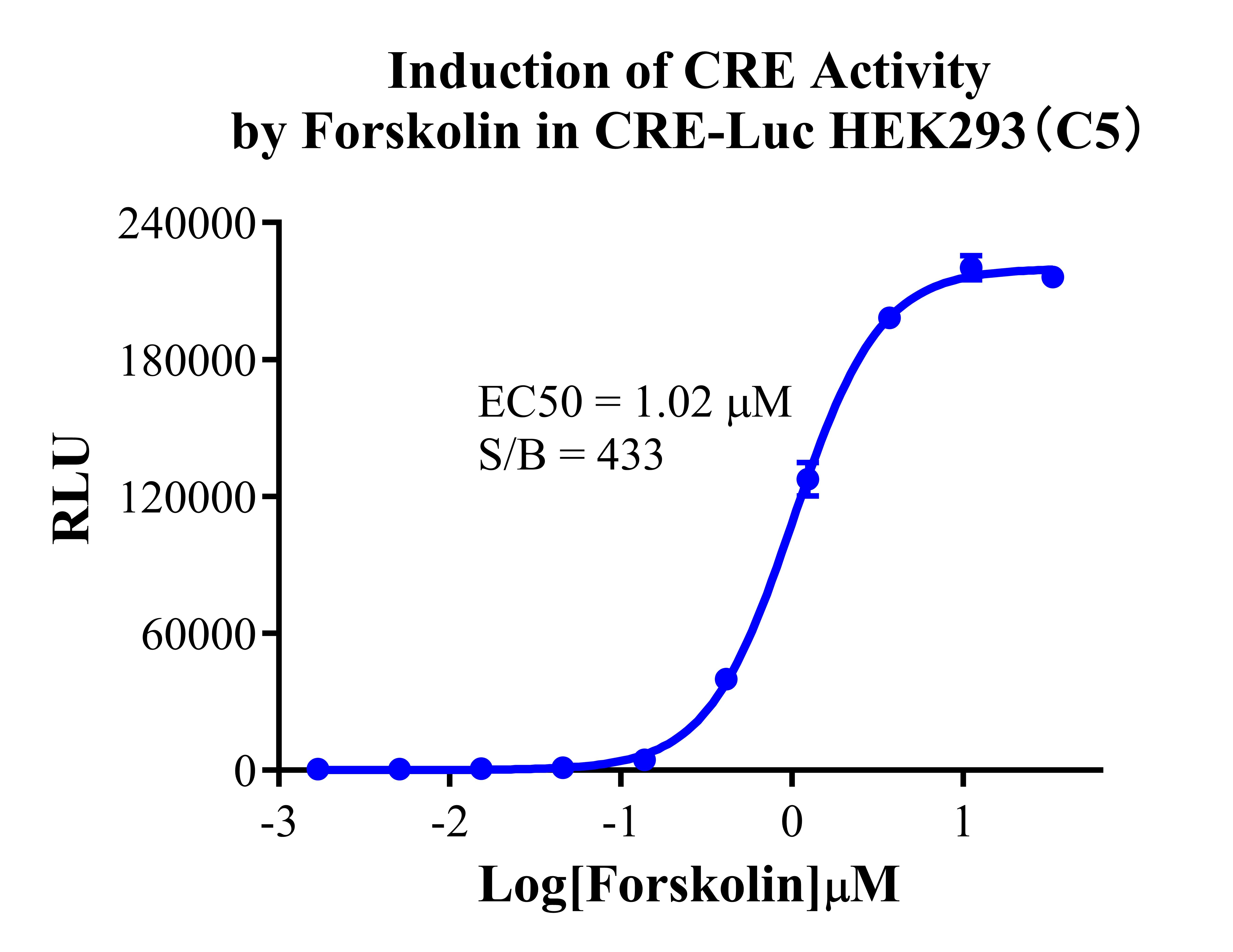 Figure 2. Detect Luciferase assay by Ultra Luciferase Detection Kit CBPH0001(we strongly suggest to purchase from Cobioer). Induction of CRE activity by Forskolin in CRE-Luc HEK293(C5).