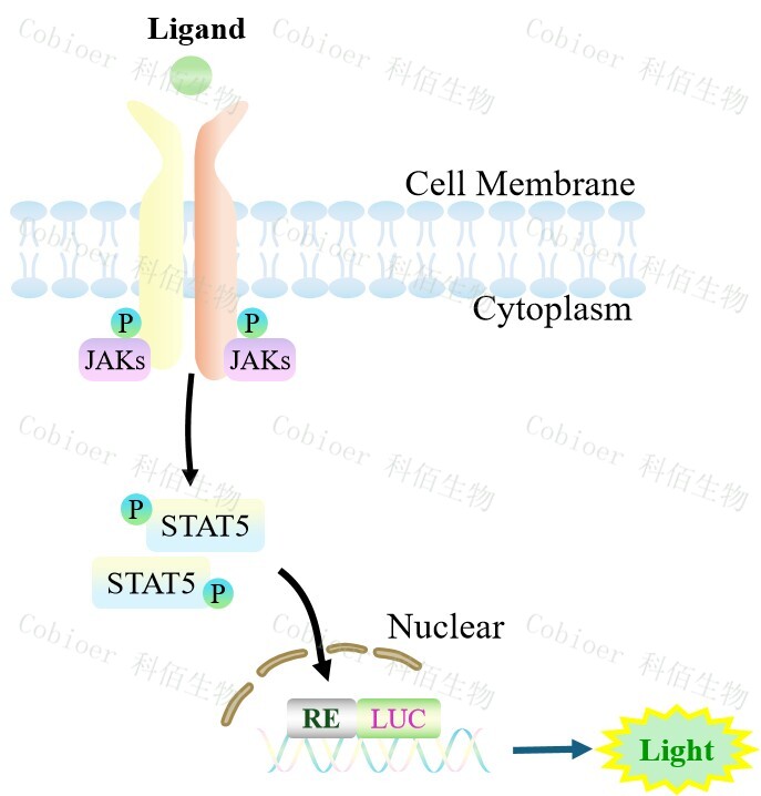 STAT5-Luc BaF3 報告基因細胞,是由 STAT5 調(diào)控并表達 Luc 熒光素酶 報告基因的 BaF3 細胞。IL3 與受體結(jié)合,激活 STAT5 的原理見下圖所示。![]() Figure 1. STAT5-Luc BaF3 細胞模型原理圖 |