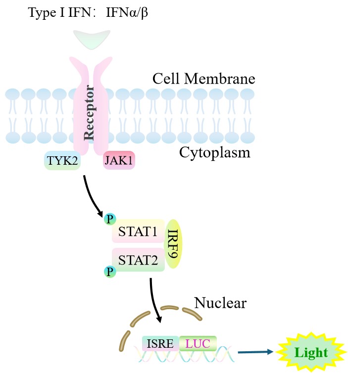 ISRE-Luc THP-1 報告基因細胞是由 ISRE 調(diào)控并表達 Luc 熒光素酶報 告基因的 THP-1 細胞。IFN 與受體結(jié)合,激活 ISRE 的原理見下圖所示。