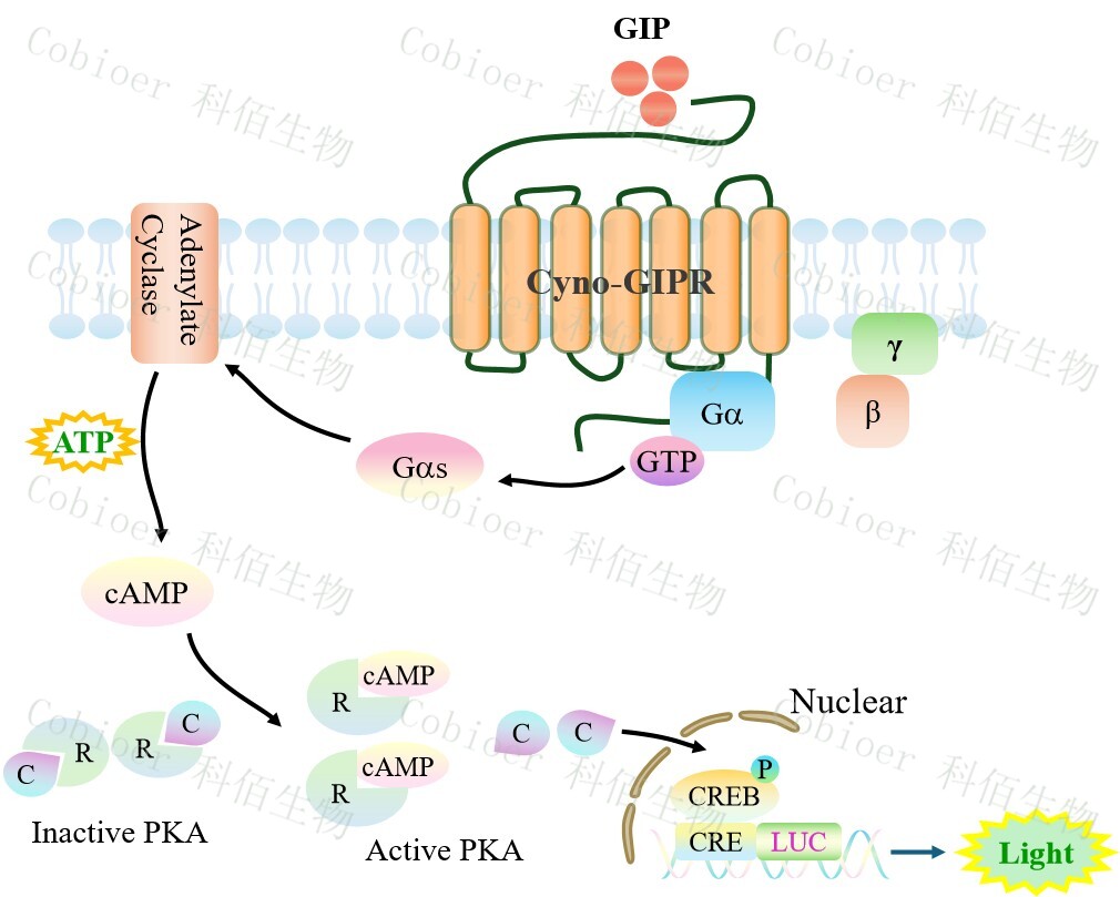 Cyno GIPR CRE-Luc HEK293 報告基因藥靶模型很好的模擬了體內(nèi) GIPR 的信號轉(zhuǎn)導(dǎo)過程,原理見下圖所示。