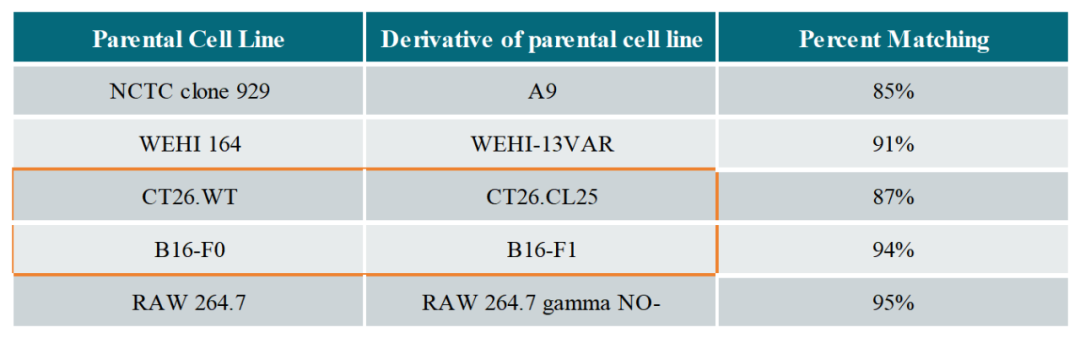 1. B16-F0、B16-F1等衍生細(xì)胞系STR匹配度>90%,無(wú)法區(qū)分。