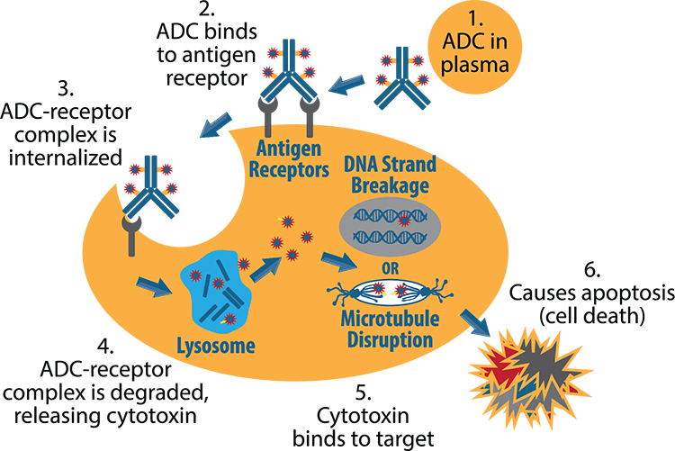 ADC藥物通過靜脈注射到血液中,隨著血液的流動,到達全身,但是科學家估計只有0.1%的ADC能到達患者的癌細胞。大部分會在循環(huán)系統(tǒng)和其他器官及組織中逐漸分解。到達癌細胞的ADC藥物一般是經(jīng)歷6個過程來起作用。