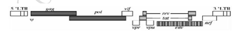HIV-1為雙鏈RNA病毒,共有9個基因,如圖1所示。gag、pol、env3個基因編碼病毒的基本結(jié)構(gòu),tat、rev為調(diào)節(jié)基因,vif、vpr、vpu、nef 4個為輔助基因。其中,gag基因編碼病毒的核心蛋白,包括基質(zhì)蛋白、衣殼蛋白、核衣殼蛋白;pol基因編碼病毒復制所需的酶,如反轉(zhuǎn)錄酶、整合酶、蛋白酶,env基因編碼病毒的包膜糖蛋白,決定病毒感染宿主的靶向性。rev編碼的蛋白調(diào)節(jié)gag、pol、env的表達水平,tat編碼的蛋白參與RNA轉(zhuǎn)錄的控制。4個輔助基因編碼的蛋白則作為毒力因子參與宿主細胞的識別和感染。兩端為長末端重復序列(LTR),內(nèi)含復制所需的順式作用元件,如包裝信號元件Ψ。
