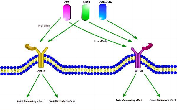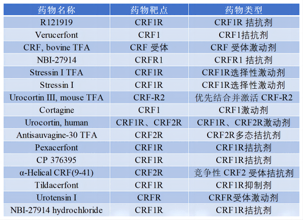 CRF1R和CRF2R主要是通過偶聯(lián)下游Gs蛋白參與體內(nèi)內(nèi)分泌系統(tǒng)、行為系統(tǒng)和免疫系統(tǒng)的壓力應(yīng)答。CRF1R和CRF2R在體內(nèi)被內(nèi)源性配體CRF和UCN1-3 激活。與UCN1對CRF1R和CRF2R都有高親和力不同,CRF對CRF1R的親和力明顯高于CRF2R,而UCN2和UCN3則表現(xiàn)出了對CRF2R選擇性激動(dòng)劑的活性。