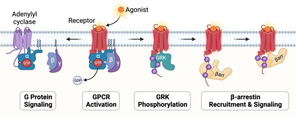 G蛋白偶聯(lián)受體(GPCR)是真核生物中最大,種類最多的膜受體。目前,F(xiàn)DA 批準(zhǔn)上市的臨床藥物中,約三分之一的藥物作用于 GPCRs發(fā)揮治療作用,GPCRs 被認(rèn)為是新藥研發(fā)領(lǐng)域中最重要,也是最有應(yīng)用前景的藥物靶點(diǎn)之一。GPCR 可被多種配體激活,與配體結(jié)合后,GPCR 的構(gòu)象會(huì)發(fā)生變化,從而導(dǎo)致特定效應(yīng)蛋白的募集和激活,并觸發(fā)下游信號(hào)通路的調(diào)節(jié)。GPCR的下游信號(hào)主要由G蛋白和β-arrestin介導(dǎo)。兩種信號(hào)之間的平衡可以受到偏向性配體的調(diào)控。偏向性配體選擇性激活某些信號(hào),同時(shí)減少或阻止其它信號(hào),為開(kāi)發(fā)副作用小的藥物提供了方向。