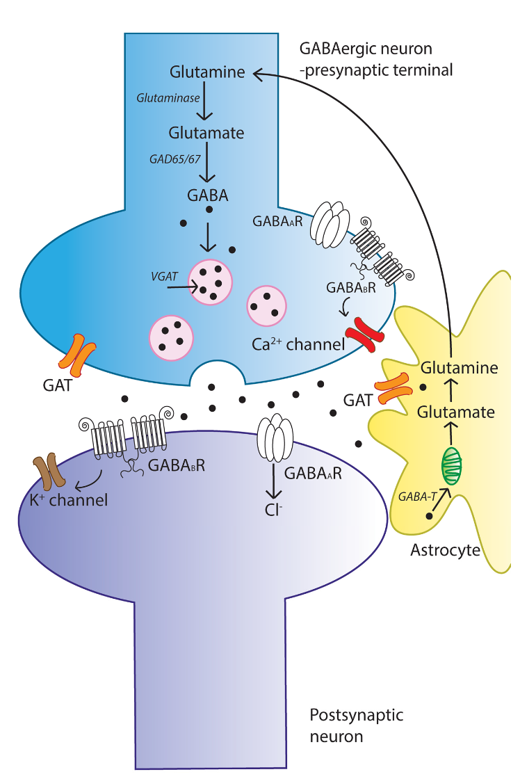 GABA的合成是通過(guò)谷氨酸酸脫羧酶(GAD)對(duì)L-谷氨酸的α-脫羧作用進(jìn)行的,并依賴于輔酶吡哆醛-5'-磷酸(維生素B6的一種維生素)。GAD存在兩種主要的亞型:65 kDa亞型(GAD65)和67 kDa亞型(GAD67)。GAD65是哺乳動(dòng)物大腦中表達(dá)的GAD的主要亞型,主要定位于突觸體的軸突末端,容易與質(zhì)膜相互作用,而GAD67則更廣泛地分布于細(xì)胞的細(xì)胞質(zhì)中。兩種GAD亞型的差異分布與細(xì)胞內(nèi)兩種GABA的存在相吻合,一種存在于囊泡中,另一種存在于細(xì)胞質(zhì)中,它們通過(guò)不同的機(jī)制釋放。GABA通過(guò)囊泡GABA轉(zhuǎn)運(yùn)蛋白(vGAT)的作用被募集到突觸囊泡中。在膜去極化后,GABA被釋放到突觸中,并可與突觸后膜上的嗜離子性GABA受體(GABAAR)或代謝性GABB受體(GABABR)結(jié)合,從而抑制突觸后神經(jīng)元。釋放的GABA通過(guò)膜結(jié)合的GABA轉(zhuǎn)運(yùn)體(GATs)從突觸中清除,在星形膠質(zhì)細(xì)胞中,GABA被循環(huán)進(jìn)入突觸囊泡或被線粒體吸收,在線粒體中被GABA轉(zhuǎn)氨酶(GABA- t)代謝為谷氨酰胺供神經(jīng)元攝取。