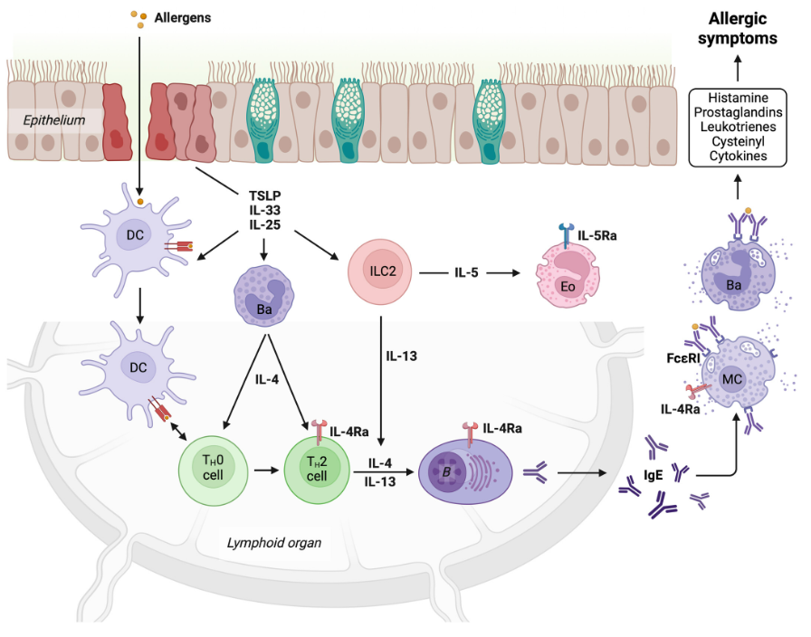 過敏的病因與Ⅱ型炎癥反應(yīng)密切相關(guān),會導(dǎo)致過敏原特異性免疫球蛋白E(IgE)的產(chǎn)生,這是許多過敏性疾病的關(guān)鍵驅(qū)動因素。在高水平上,初始的過敏原暴露會破壞上皮的完整性,通過包括IL-25、IL-33和TSLP在內(nèi)的細(xì)胞因子觸發(fā)局部炎癥,這些炎癥激活Ⅱ型先天淋巴樣細(xì)胞以及其他免疫細(xì)胞來分泌Ⅱ型細(xì)胞因子IL-4、IL-5和IL-13,促進Th2細(xì)胞的發(fā)育和嗜酸性粒細(xì)胞的招募。Th2細(xì)胞依賴的B細(xì)胞激活促進了過敏原特異性IgE的產(chǎn)生,IgE穩(wěn)定地與嗜堿性細(xì)胞和肥大細(xì)胞表面的Fc段含高親和力受體(FcεRI)結(jié)合。在過敏原再次暴露后,這些細(xì)胞迅速脫粒導(dǎo)致過敏癥狀。