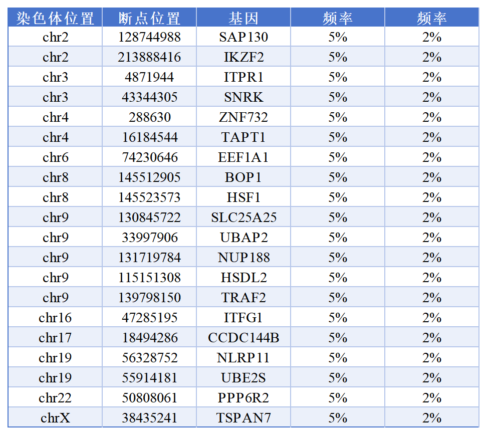 目前檢測ISA的方法有LM-PCR、NGS、單細(xì)胞測序等,為了保證檢測的準(zhǔn)確性,科佰生物開發(fā)了一系列慢病毒整合位點(diǎn)標(biāo)準(zhǔn)品供檢測機(jī)構(gòu)使用,作為品質(zhì)衡量的標(biāo)尺對(duì)檢測能力進(jìn)行判別。在前文 慢病毒整合位點(diǎn)標(biāo)準(zhǔn)品強(qiáng)勢(shì)來襲一文中,已對(duì)單克隆多插入位點(diǎn)、單克隆單插入位點(diǎn)、性染色體插入位點(diǎn) 做了產(chǎn)品的說明及數(shù)據(jù)展示。近期科佰推出了5% 2% 整合頻率的慢病毒多克隆多整合位點(diǎn)參考品,由多個(gè)單克隆整合位點(diǎn)產(chǎn)品混合而來,覆蓋20個(gè)插入位點(diǎn),分別來自11個(gè)不同染色體上的20個(gè)基因,如下表所示