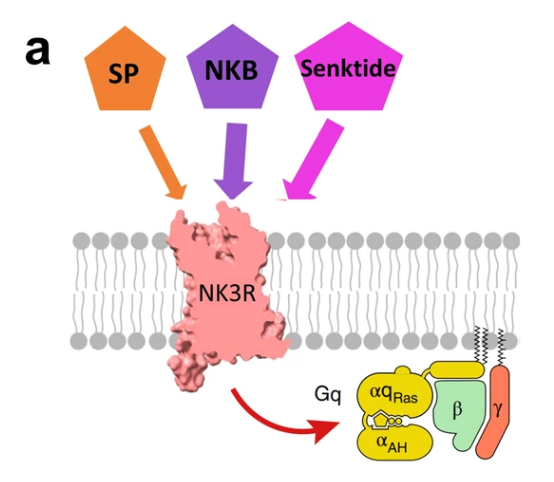 速激肽是在整個神經(jīng)和免疫系統(tǒng)中表達(dá)的神經(jīng)肽,作為興奮性神經(jīng)遞質(zhì),它們在調(diào)節(jié)各種生理功能中很重要。在不同的速激肽中,P物質(zhì)(SP)、神經(jīng)激肽A(NKA) 和NKB已得到充分研究。這些肽可以通過三種不同的G蛋白偶聯(lián)受體(GPCR)、神經(jīng)激肽1受體 (NK1R)、神經(jīng)激肽2受體(NK2R)和NK3R發(fā)揮作用,作為具有不同親和力的完全激動劑。NKB、SP和NKA是10-11個氨基酸的線性肽,它們共享一個保守的C端基序-Phe-Xaa-Gly-Leu-Met-NH2,介導(dǎo)神經(jīng)激肽受體激活,而速激肽神經(jīng)肽的不同N末端與神經(jīng)激肽受體的優(yōu)先結(jié)合。NKB優(yōu)先激活與G蛋白Gαq偶聯(lián)的NK3R進(jìn)行細(xì)胞內(nèi)信號轉(zhuǎn)導(dǎo),而 SP和NKA分別優(yōu)先與NK1R和NK2R結(jié)合。SP還可以激活NK3R,但活性低于NKB 。SP 類似物Senktide是一種六肽,在6位有 Asp,在8位有甲基化Phe,N端受琥珀酸保護(hù)。此外,Senktide比內(nèi)源性配體NKB和SP更有效地激活 NK3R。