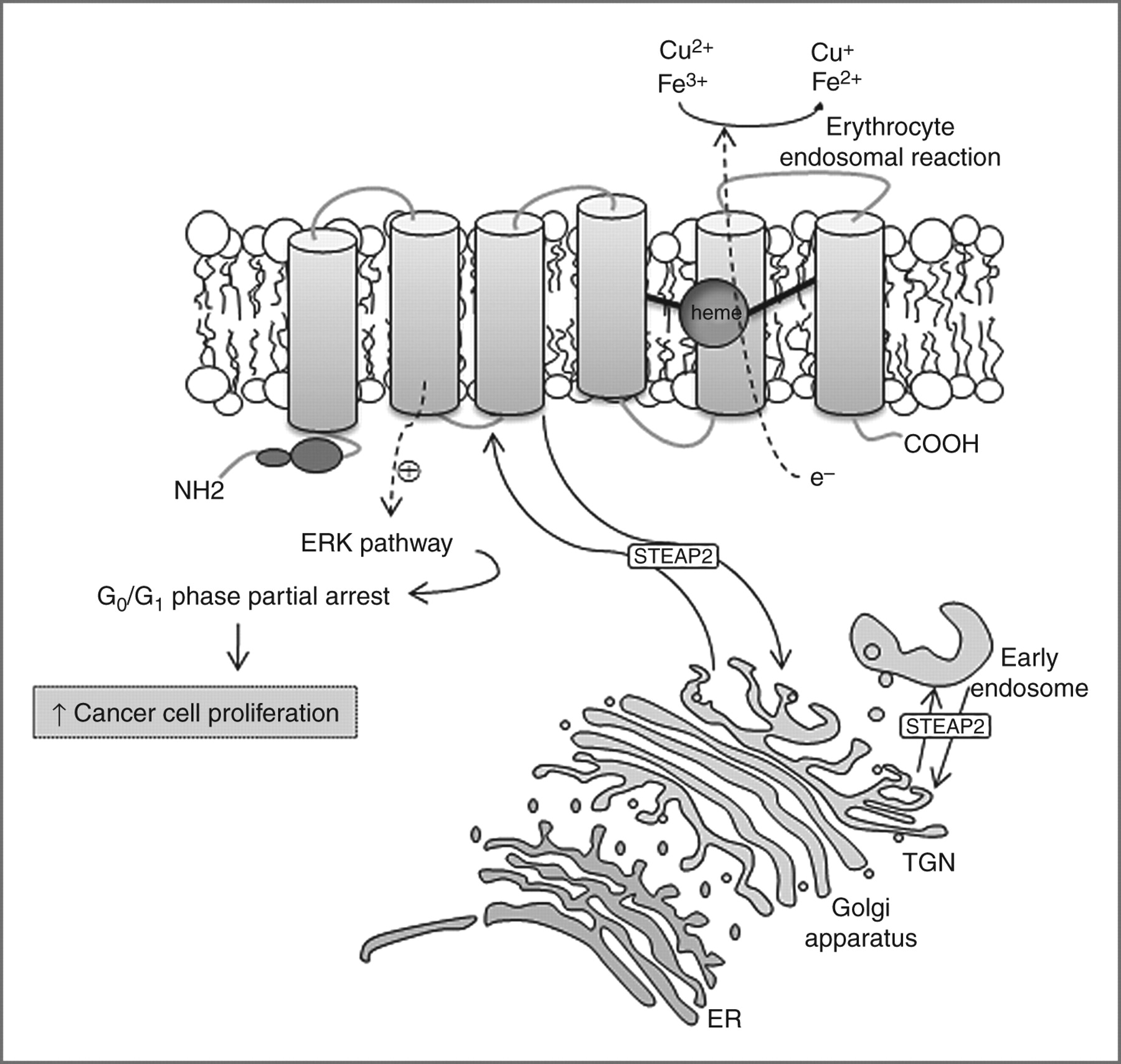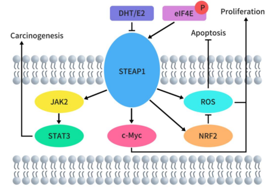 STEAP2,又被稱為前列腺六跨膜蛋白 1(STAMP1),是一種由 490 個氨基酸組成的(56.1 kDa)蛋白質(zhì),其在高爾基體復合體、跨高爾基體網(wǎng)絡以及質(zhì)膜中高度表達。這表明 STEAP2 參與了某些內(nèi)吞和外排運輸途徑。STEAP2 有助于紅細胞中 Fe3+ 和 Cu2+ 的正常攝取,并將其還原為 Fe2+ 和 Cu+,從而促進轉(zhuǎn)鐵蛋白循環(huán)的進行。通過激活 ERK 通路,STEAP2 誘導癌細胞在 G0-G1 細胞周期階段的部分停滯,從而增加細胞增殖和腫瘤發(fā)展。