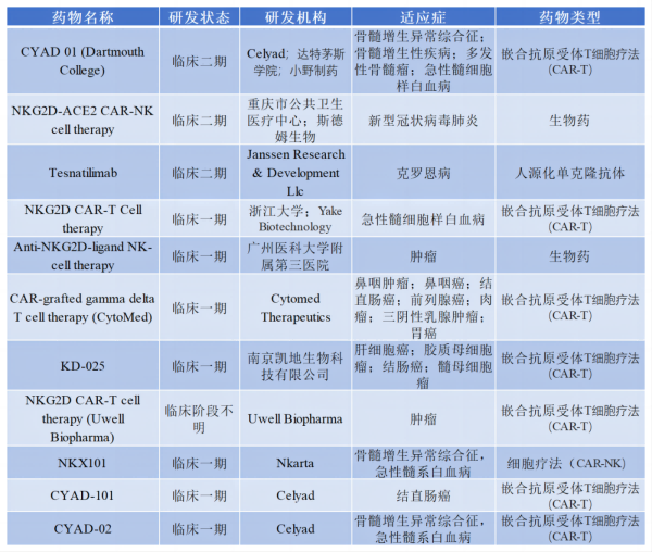 截至目前,全球有11種針對(duì)NKG2D的在研藥物,主要集中在臨床早期,其中以CAR-T細(xì)胞療法為作用機(jī)制的就有10種。而CAR-NK療法因?yàn)闆](méi)有發(fā)現(xiàn)細(xì)胞因子釋放綜合癥及神經(jīng)毒性等副作用,因而比CAR-T療法具有優(yōu)勢(shì),這可能是由于NK細(xì)胞本身不容易導(dǎo)致過(guò)高的細(xì)胞因子分泌。除此之外CAR-NK療法不需要以患者的自體免疫細(xì)胞作為來(lái)源、治療成本更低等優(yōu)勢(shì)可能使它成為CAR-T療法的一大競(jìng)爭(zhēng)對(duì)手。除抗腫瘤藥物外,強(qiáng)生旗下的楊森公司針對(duì)該靶點(diǎn)在自身免疫疾病方面的作用開(kāi)發(fā)了一款單抗類藥物,通過(guò)抑制該靶點(diǎn)活性來(lái)降低克羅恩病患者的炎癥反應(yīng)。