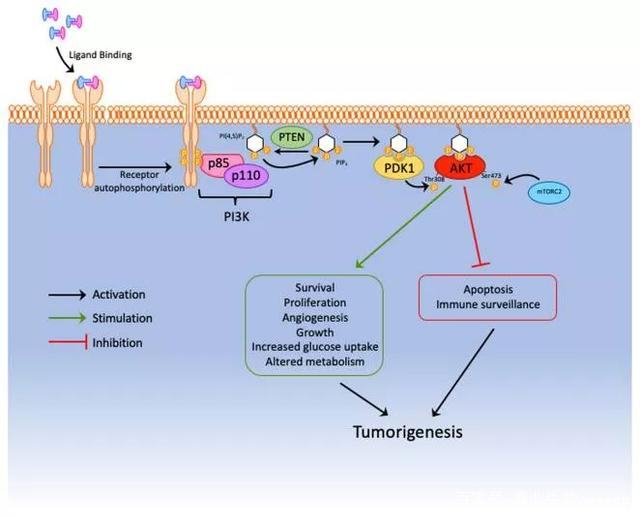 圖1. PTEN抑制PI3K途徑和AKT的下游致癌信號(hào)。通過(guò)使PIP3磷酸化,PTEN阻止了PDK1激活A(yù)KT,從而防止了腫瘤的發(fā)生。