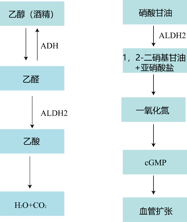 ALDH2(acetaldehyde dehydrogenase 2),線粒體乙醛脫氫酶2,位于第12號(hào)染色體的12q24.2位置,全長43,438bp,共有15個(gè)外顯子,編碼由517個(gè)氨基酸殘基組成的蛋白質(zhì)。ALDH2是人體催化硝酸甘油生物轉(zhuǎn)化的主要途徑,該酶同時(shí)具有脫氫酶和酯酶的催化活性,其酯酶活性可以通過將硝酸甘油脫硝產(chǎn)生NO,進(jìn)而引起血管擴(kuò)張。