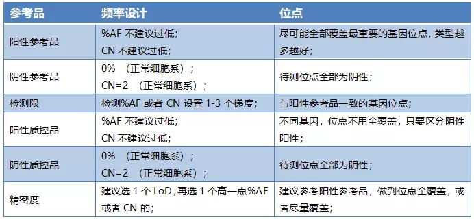 2.陽(yáng)性參考品設(shè)置最為復(fù)雜,著重聚焦臨床意義的基因位點(diǎn),不要求全覆蓋,同時(shí)要考慮靈敏度(最低檢出限LoD)設(shè)置,考慮到濃度梯度或突變梯度的不同,應(yīng)對(duì)各水平陽(yáng)性參考品設(shè)置相應(yīng)檢出要求;