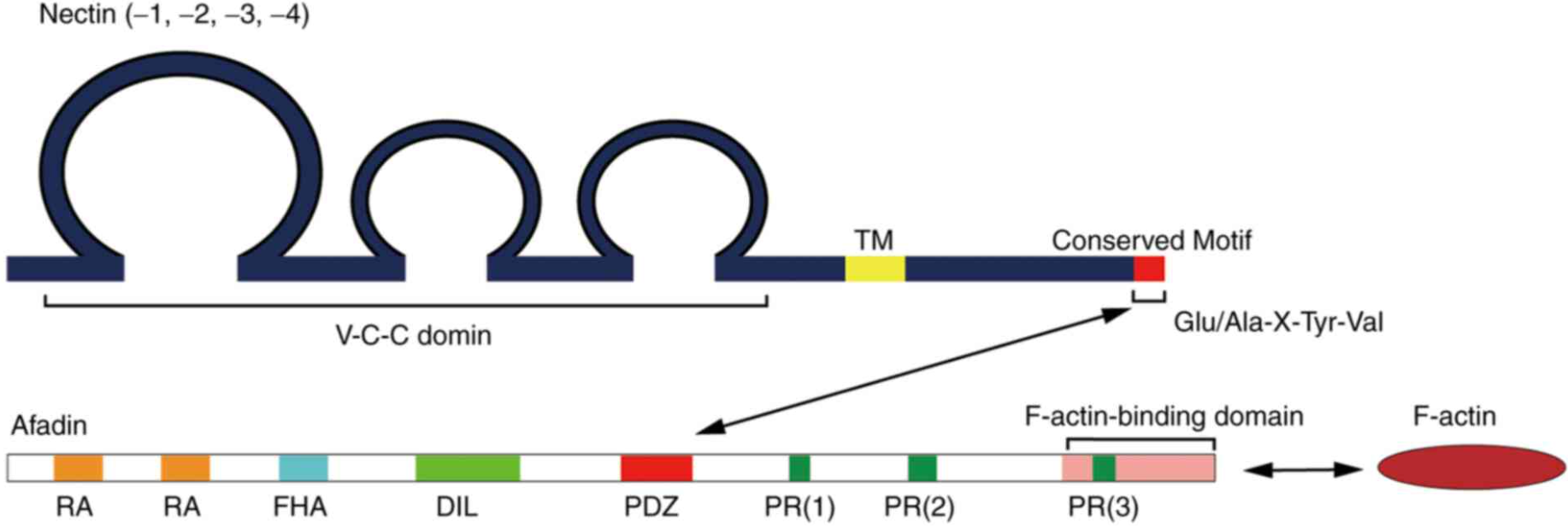 胞質(zhì)尾的C端都包含一個(gè)afadin (一種 F-肌動(dòng)蛋白結(jié)合蛋白)結(jié)合基序,與Nectin-4不同的是,Nectin-1、Nectin-2、Nectin-3的afadin結(jié)合基序都是保守序列 Glu/Ala-X-Tyr-Val,可與 afadin的PDZ 結(jié)構(gòu)域結(jié)合;而Nectin-4可通過其C末端的 Gly-His-Leu-Val 基序與銜接分子afadin結(jié)合。當(dāng)Nectins與銜接分子afadin結(jié)合后,afadin會(huì)結(jié)合并募集絲狀肌動(dòng)蛋白組件 (F-actin),從而促進(jìn)細(xì)胞與細(xì)胞之間的粘附。Nectin家族與鈣黏著蛋白共同作用,對(duì)粘著連接和緊密連接的產(chǎn)生和維持具有顯著影響,它們調(diào)節(jié)多種細(xì)胞行為,包括細(xì)胞粘附、生長、分化、遷移和凋亡。