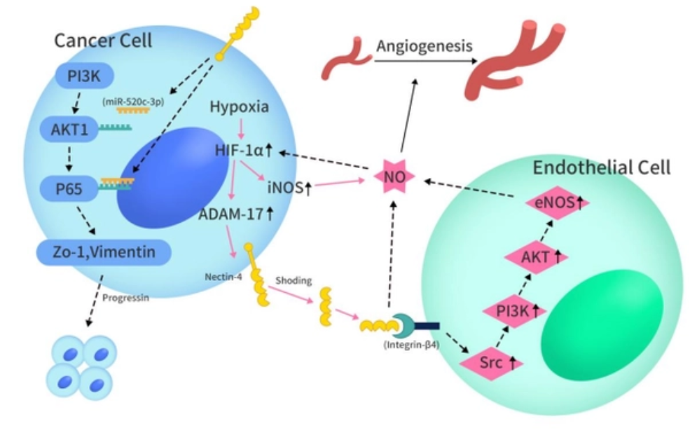 Nectin-4在正常的胚胎和胎兒組織中含量很高,但成年人的正常組織中通常表達(dá)較低,且在各種癌細(xì)胞上表達(dá)較高,比如宮頸癌、尿路上皮癌、乳腺癌、肺癌、胃癌、頭頸癌、胰腺癌等,主要通過激活PI3K/Akt途徑促進(jìn)腫瘤細(xì)胞增殖、分化、遷移、侵襲等。