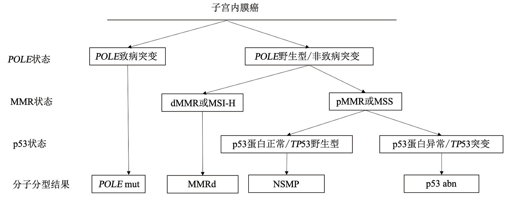 2013年美國癌癥基因組圖譜(TCGA),依據(jù)子宮內(nèi)膜癌全基因組、轉(zhuǎn)錄組、蛋白組等多組學檢測結(jié)果,將其分為POLE突變型、微衛(wèi)星不穩(wěn)定突變型、低拷貝數(shù)型和高拷貝數(shù)型等4種類型。2023年國際婦產(chǎn)科聯(lián)盟(International Federation of Gynecology and Obstetrics,F(xiàn)IGO)分期建議,所有的子宮內(nèi)膜癌EC患者均應完善分子分型檢測。